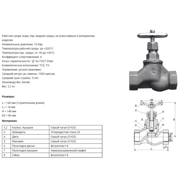 Вентиль запорный проходной муфтовый,Среда-вода,пар при температуре 225С. Присоединение к трубопроводу муфтовое по ГОСТу 6527-68. Материал корпуса-ковкий чугун