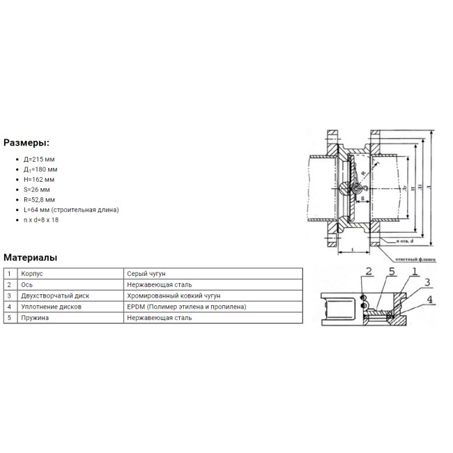 Двустворчатые клапаны для избегания протекания рабочей среды в обратном направлении. Используется в масляных и химических установках, в системах передачи питьевой и технической воды, воздуха, нейтральных газов, слабонасыщенного газа. Производимые диаметры клапанов откидных DN 40 – DN 600