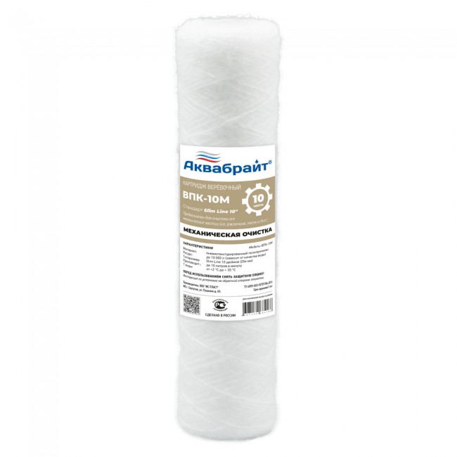Веревочный Картридж АКВАБРАЙТ для механической очистки воды. Пористость 10 мкм. Типоразмер SLIMLINE 10 дюймов. Изготовлен из ПНЕВМОТЕКСТУРИРОВАННОЙ полипропиленовой веревки.