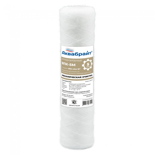 Веревочный Картридж АКВАБРАЙТ для механической очистки воды. Пористость 5 мкм. Типоразмер SLIMLINE 10 дюймов. Изготовлен из ПНЕВМОТЕКСТУРИРОВАННОЙ полипропиленовой веревки.