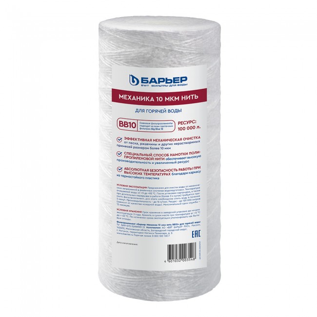 Картридж БАРЬЕР «Механика 10 мкм нить для горячей воды» задерживает механические примеси более 10 мкм (песок, ржавчину и др.).
