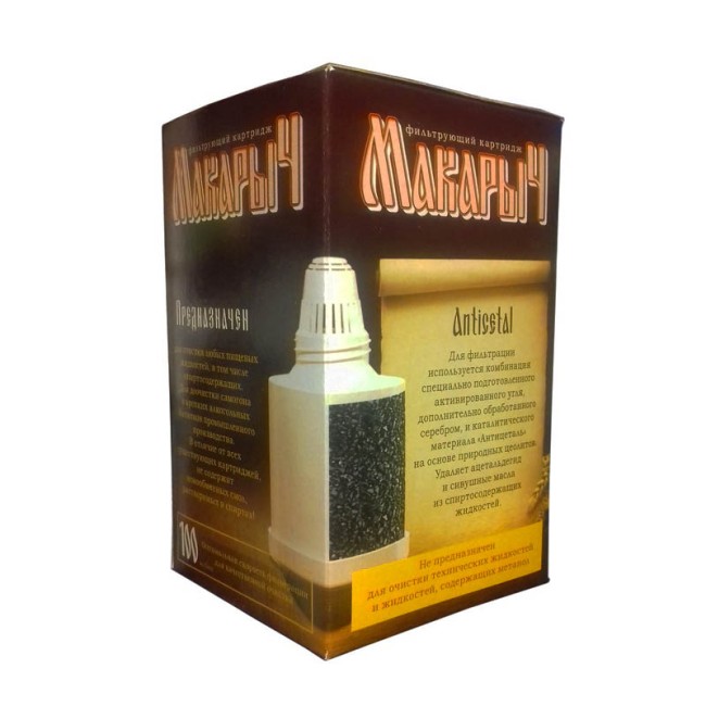 Количество в упаковке: 1шт. Макарыч разработан специально для очистки спиртосодержащих жидкостей до 95°. Картридж Макарыч содержит посеребренный активированный кокосовый уголь с материалом Anticetal, который эффективно удаляет неприятный запах, мутность, опасные соединения и осадки, а также альдегиды и сивушные масла — главные причины похмельного синдрома и неприятного запаха. Картридж не содержит ионообменных смол, растворяющихся в спиртосодержащих жидкостях. 1 картридж = 2 ведра чистой водки, самогона или ректификата. Также фильтр Макарыч подходит для фильтрации колодезной и водопроводной воды; очищает воду для домашних заготовок.