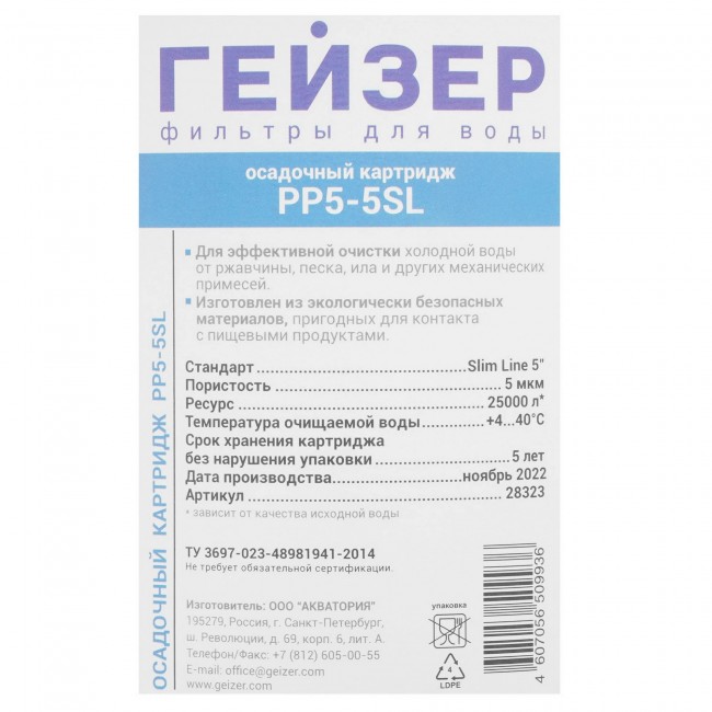 Компания Гейзер произвела высококачественные картриджи серии PP для механической очистки фильтров, подходит как для холодной, так и для горячей воды. Фильтрующим материалом является вспененный полипропилен, с пористостью 10 мкм. Восстановлению не подлежит, по окончания ресурса следует заменить на новый. Купив сменные картриджи от производителя Гейзер в нашем интернет-магазине, вы будете довольны результатом очистки.