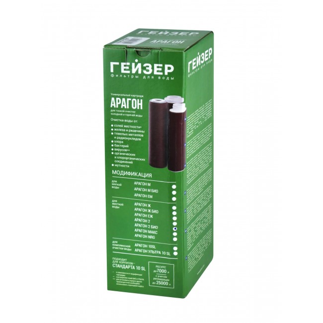 Арагон — картридж комбинированного действия для очистки холодной и горячей воды. Благодаря сложной структуре, механизму сорбции и ионному обмену, картридж задерживает мелкие механические частицы, удаляет растворенные химические примеси, хлор, органику и микроорганизмы. Серебро в металлической форме, внедренное в структуру картриджа, предотвращает размножение отфильтрованных микроорганизмов.
