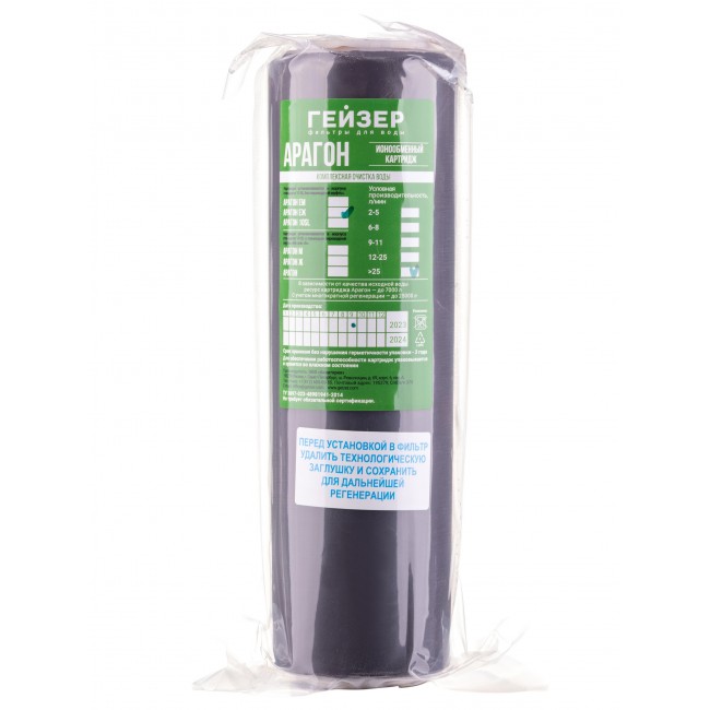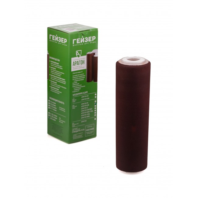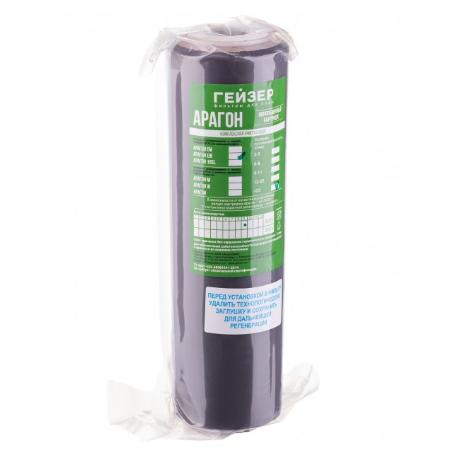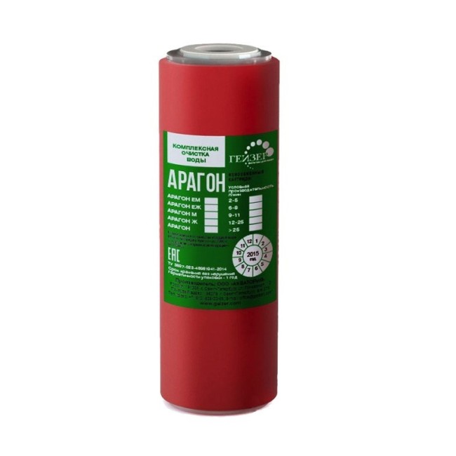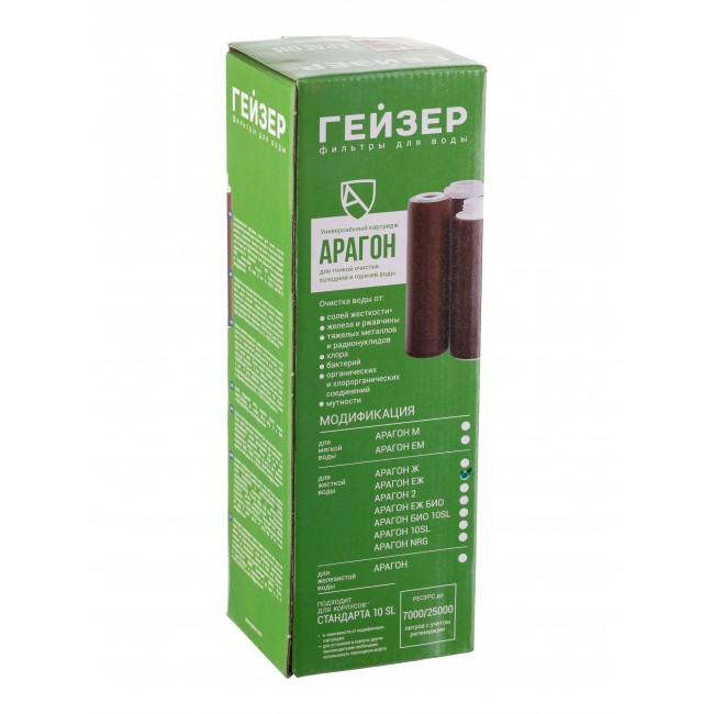 Картридж Арагон создан специально для регионов с водой, содержащей большое количество солей жесткости. Арагон это инновационный фильтроматериал, разработанный компанией Гейзер. Он представляет собой полимер комбинированного действия, который очищает воду микроглобулярным методом. Растворенные в воде химические соединения и механические частицы задерживаются структурой материала, технологией ионного обмена и сорбцией. Данный материал гарантировано удаляет все вредоносные вирусы и бактерии, в числе которых гепатит, ротавирусы и норовирусы, что подтверждено экспертизой Института им. Пастера. В структуре полимера содержится серебро, препятствующее размножению бактерий и вирусов в корпусе фильтра.