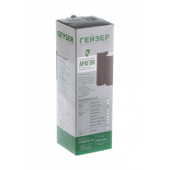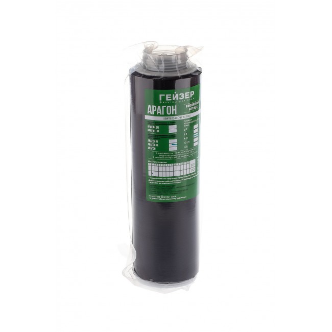 Картридж Арагон создан специально для регионов с водой, содержащей большое количество солей жесткости. Арагон это инновационный фильтроматериал, разработанный компанией Гейзер. Он представляет собой полимер комбинированного действия, который очищает воду микроглобулярным методом. Растворенные в воде химические соединения и механические частицы задерживаются структурой материала, технологией ионного обмена и сорбцией. Данный материал гарантировано удаляет все вредоносные вирусы и бактерии, в числе которых гепатит, ротавирусы и норовирусы, что подтверждено экспертизой Института им. Пастера. В структуре полимера содержится серебро, препятствующее размножению бактерий и вирусов в корпусе фильтра.