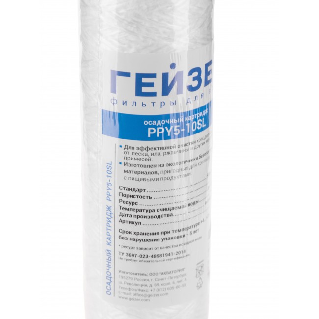 Картридж для фильтра Гейзер PPY 5-10SL производится из полипропиленовой нити. Изделие эффективно справляется с удалением песка и грязи, элементов ржавчины и нерастворенных частиц, имеющих размер до 5 мкм. Ресурс модуля равен 50000 литров, а скорость обработки воды составляет 10 л/мин.