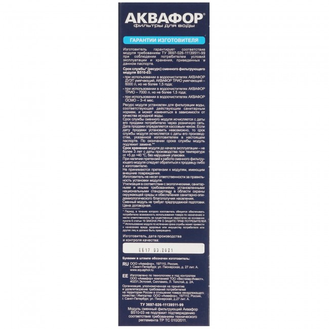 | Ресурс модуля, л | 6 000 |