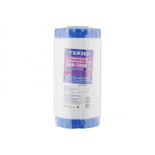 Картридж Гейзер БАФ 10ВВ с мультикомпонентной загрузкой на основе сорбентов и ионообменных материалов с серебром в металлической форме. Позволяет удалять хлор и органические примеси, а также снижать содержание железа и тяжелых металлов. Подходит для получения чистой питьевой воды в квартире, офисе, кафе, столовой, либо для очистки колодезной воды на даче.