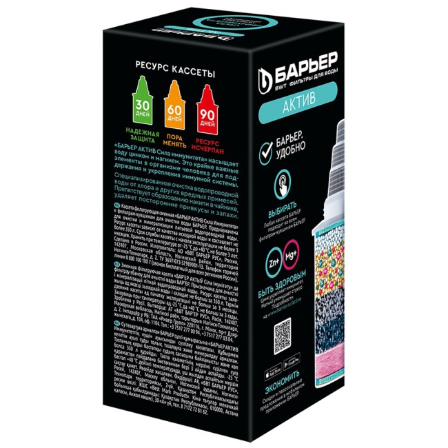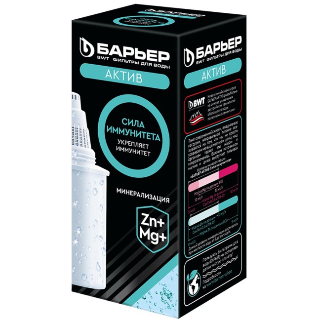 Уникальная кассета БАРЬЕР «Актив сила иммунитета» позволит не только избавиться от накипи, но и получить полезную воду, обогащенную незаменимыми элементами – магнием и цинком. Магний – главный макроэлемент, обеспечивающий хорошее самочувствие, уменьшение стресса, корректную работу сердца и мышц. Он поддерживает иммунную систему организма, замедляет процессы старения, снижает риск инфаркта. Цинк – важный нутриент, который помогает нам оставаться здоровыми. Он содержится в клетках, и помогает иммунной системе бороться с вторжением вирусов и бактерий. Цинк регулирует обмен веществ, улучшает состояние кожи, волос, ногтей. Благодаря цинку нормализуется работа печени, улучшается мозговая деятельность, уменьшаются негативные симптомы во время женского цикла. Из воды натощак цинк усваивается почти в 2 раза эффективнее, чем из продуктов питания. Элементы выделяются в ионной форме, что значительно улучшает их усваиваемость организмом.