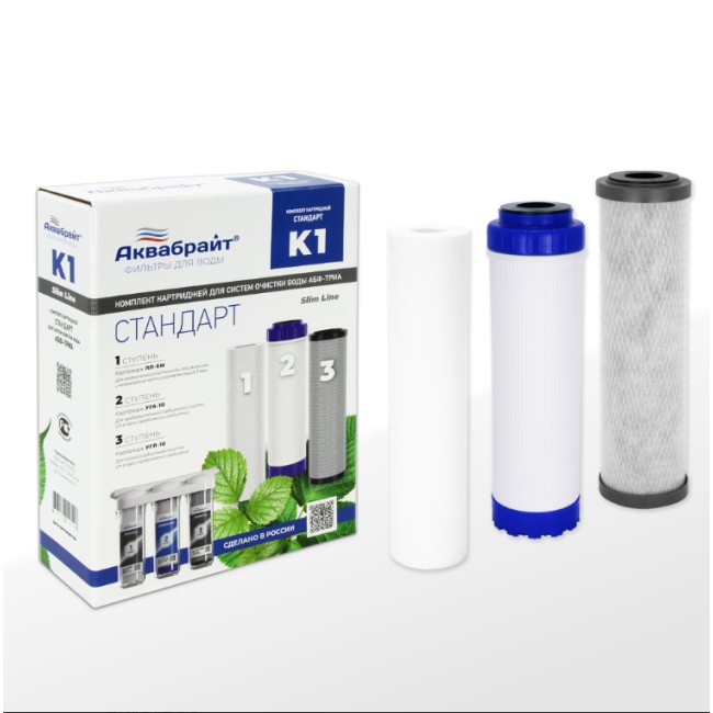 Комплект Картриджей К-1 АКВАБРАЙТ СТАНДАРТ для очистки воды. Предназначен для установки в питьевые системы серии АБФ-ТРИА под кухонную мойку. В комплект входят картриджи: ПП-5М, УГП-10, УГА-10