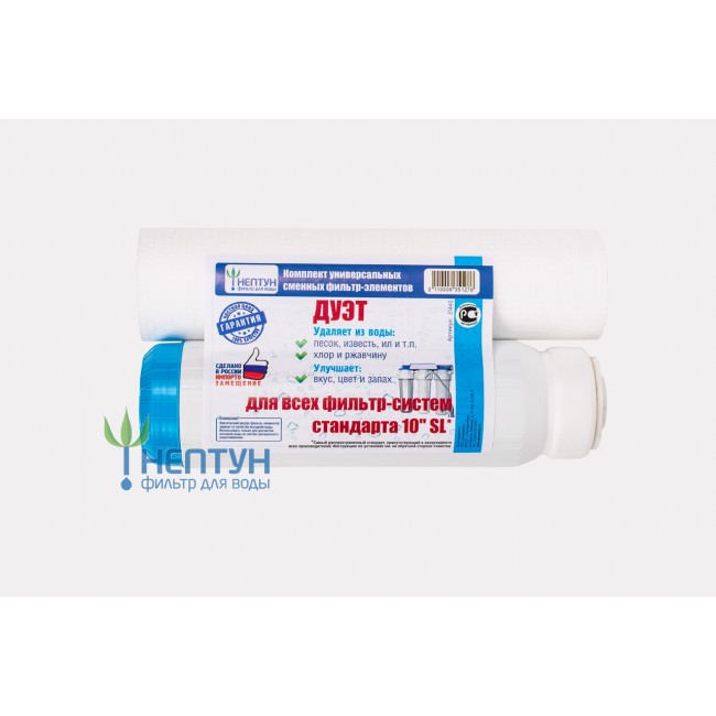 "Комплект картриджей «Дуэт» подходит для двухступенчатых фильтр-систем. Осуществляет базовую очистки воды: механическую и сорбционную. Фильтрует воду от песка, ила, ржавчины, органических соединений, а также от хлора, нефти, пестицидов и солей тяжелых металлов. Устанавливается в колбы (фильтродержатели) стандарта 10" (10sl).