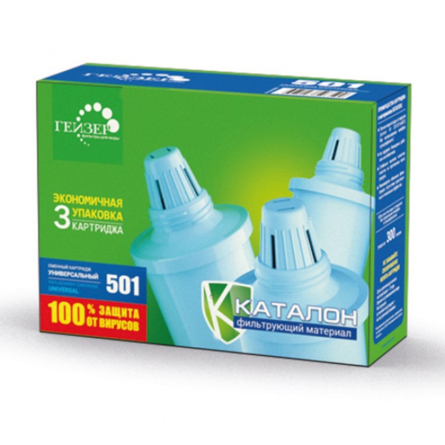 Количество в упаковке: 3шт. Универсальный и высокоэффективный картридж 501 для комплексной очистки воды воды: Универсальный картридж 501 применяется в фильтрах-кувшинах Гейзер для очистки водопроводной и скважинной воды. Ресурс: 350 л. Сменные картриджи имеют одинаковые присоединительные размеры, взаимозаменяемы и могут устанавливаться в любой фильтр-кувшин Гейзер (а с использованием переходников — в кувшины других производителей). Картридж 501 для мягкой воды имеет пять степеней очистки: Материал Каталон удаляет железо, тяжелые металлы, органические и хлорорганические соединения, бактерии и вирусы; Ионообменная смола - удаление растворенных примесей; Высококачественный кокосовый уголь удаляет хлор, органические и хлорорганические соединения, устраняет неприятные запахи и привкусы воды; Серебро в металлической несмываемой форме для подавления жизнедеятельности болезнетворных бактерий; Механический постфильтр предотвращает вынос фильтрующих материалов в очищенную воду.