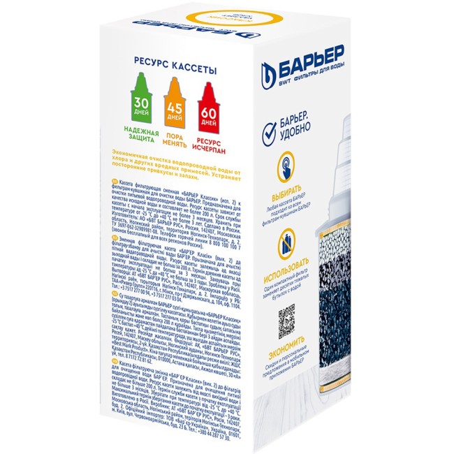 Кассета «Классик» помогает удалить из водопроводной воды различные примеси механического происхождения, а также хлор, железо в растворенном виде, тяжелые металлы, посторонние запахи и привкусы. Одна кассета для фильтра способна очистить до 200 литров воды.