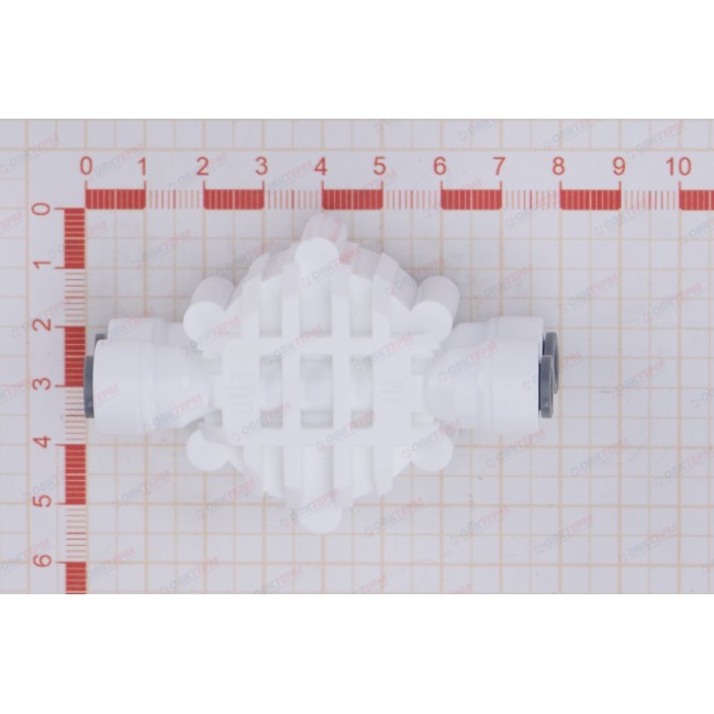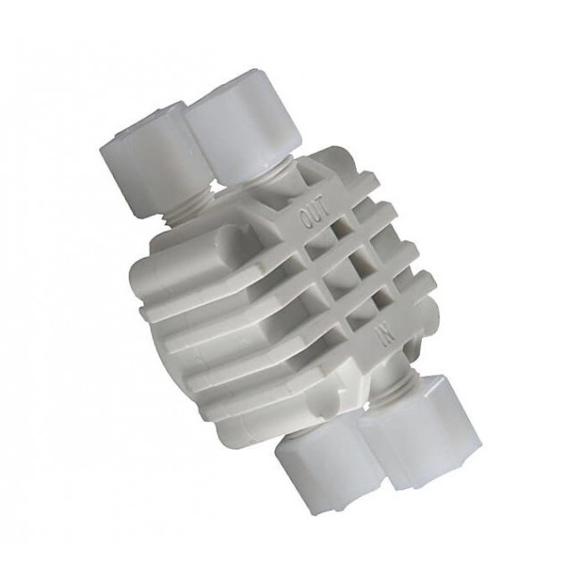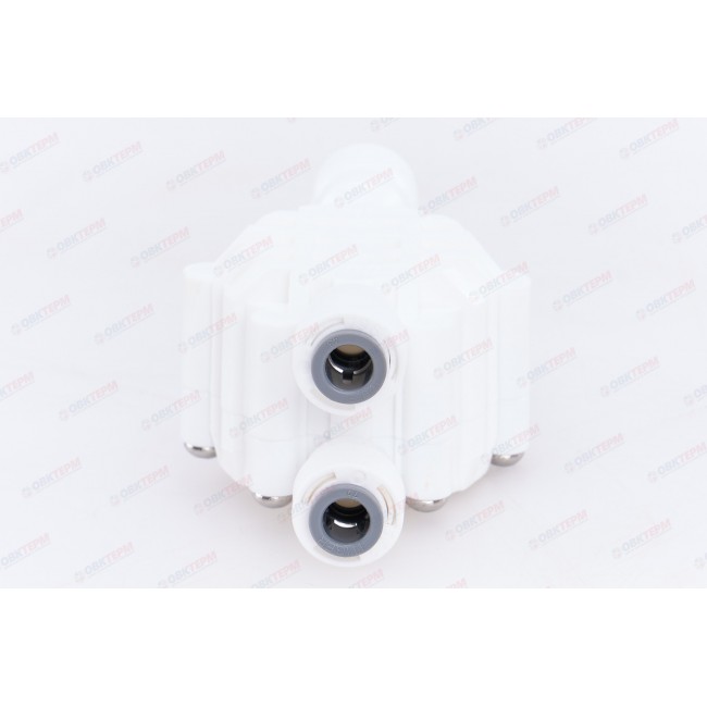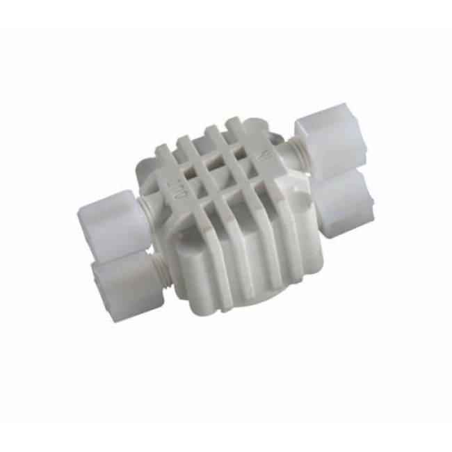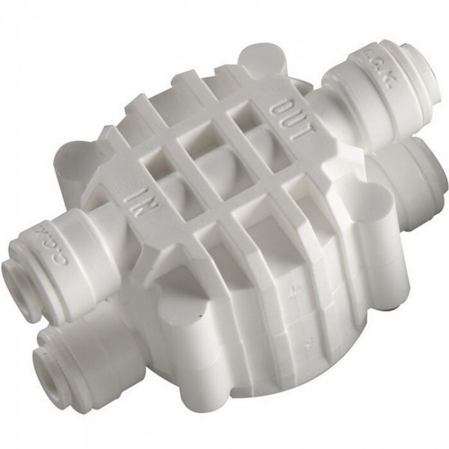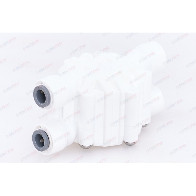 Автопереключатель (4-х ходовой клапан дренажа автоматический затворный 1/4 дюйма) служит для переключения потока воды при наполнении накопительного бака в установках обратного осмоса «Гейзер Престиж» и «Гейзер Аллегро». Применяется для автоматического выключения системы обратного осмоса в случае закрытия крана чистой воды и полного заполнения накопительной емкости, а также для включения системы при открытии крана. Данное устройство предотвращает попадание сбрасываемой в канализацию грязной воды обратно в систему, а также очищенной воды - из бака в фильтр. Служит также для защиты мембраны от холостого тока воды. Клапан состоит из корпуса, изготовленного из пластика пищевого класса, двух резиновых мембран разного диаметра, штока и оснащен цангами для подключения диаметром ¼ дюйма «John Guest». Надписи на клапане соответствуют направлению воды (In – вход воды после картриджей, Out – выход воды на мембрану). Переключатель потоков обеспечивает бесперебойную работу водоочистительной системы.
