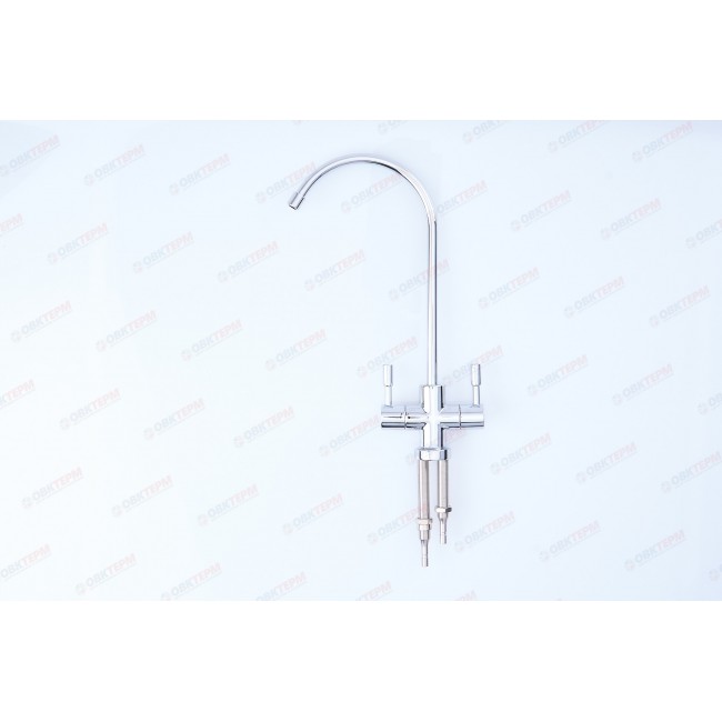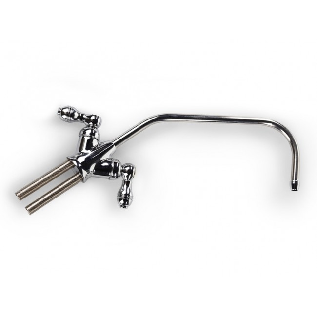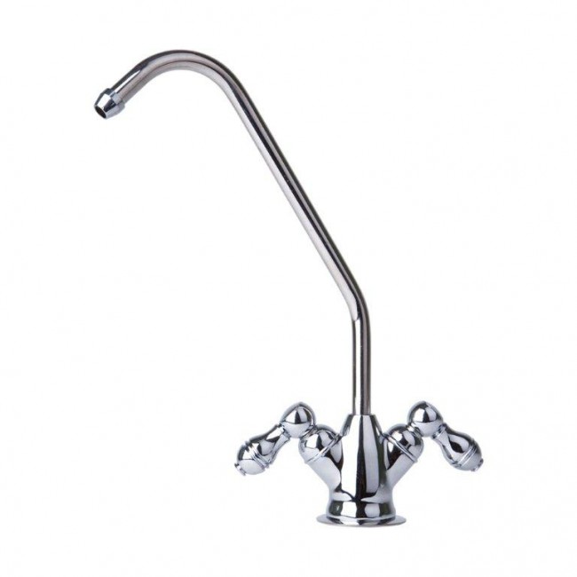 Кран с двумя вентилями обеспечивает подачу воды с минералами или без них. Кран изготовлен из современных экологически безопасных материалов с нанесением особо прочного хромированного покрытия и рассчитан на работу с холодной водой. Кран устанавливается на мойку или столешницу в любом удобном для эксплуатации месте.