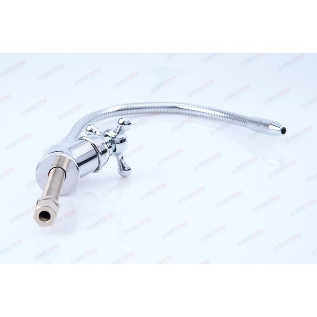 Гибкий излив в металлической оплетке позволяет изменять наклон крана для подачи воды. Кран изготовлен из современных экологически безопасных материалов с нанесением особо прочного хромированного покрытия и рассчитан на работу с холодной водой. Кран устанавливается на мойку или столешницу в любом удобном для эксплуатации месте.