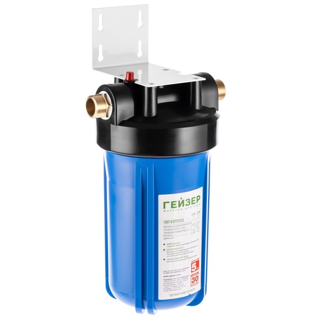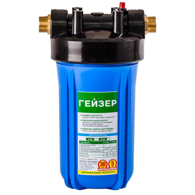 Корпус Гейзер 10BB изготовлен из синего полипропилена; крышка корпуса – черный полипропилен в комплекте с латунными ниппелями. Корпус рассчитан на работу под давлением и установку на входе в систему холодного водоснабжения. В производстве корпусов используется только первичное сырье пищевого класса.