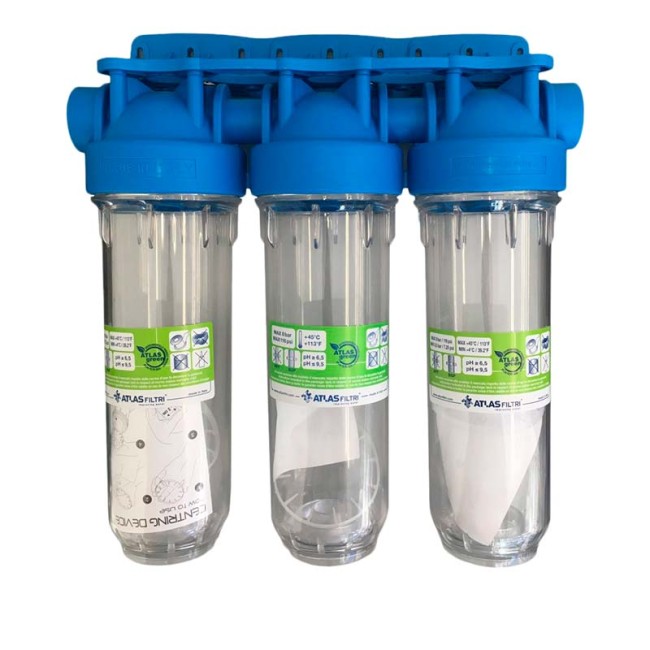 ATLAS Filtri 10 DP TRIO-1 - магистральный фильтр итальянского производства для очистки холодной воды, состоящий из трех колб смонтированных на одном пластмассовом кронштейне. В колбах фильтра ATLAS 10 DP-TRIO можно использовать стандартные 10 дюймовые полипропиленовые, угольные, умягчающий или обезжелезивающие картриджи, которые будут очищать воду от таких насущных загрязнений, как жесткость, железо, хлор и другие органические соединения.