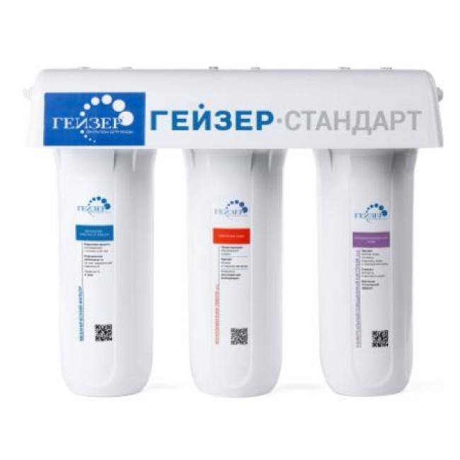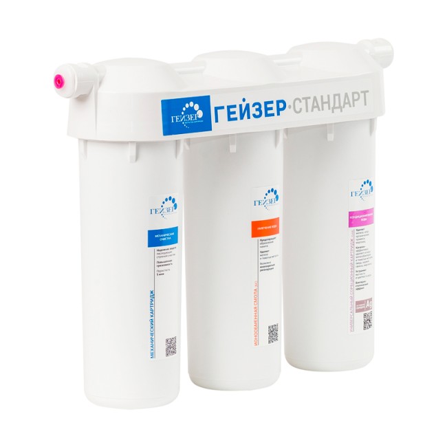 Фильтры Гейзер Стандарт очищают водопроводную воду от железа, взвешенных частиц, мутности, цветности, хлора, тяжелых металлов, органических соединений, избытка солей жесткости (модификация для жесткой воды) и других примесей. В фильтре используется стандартная схема очистки без картриджа Арагон.