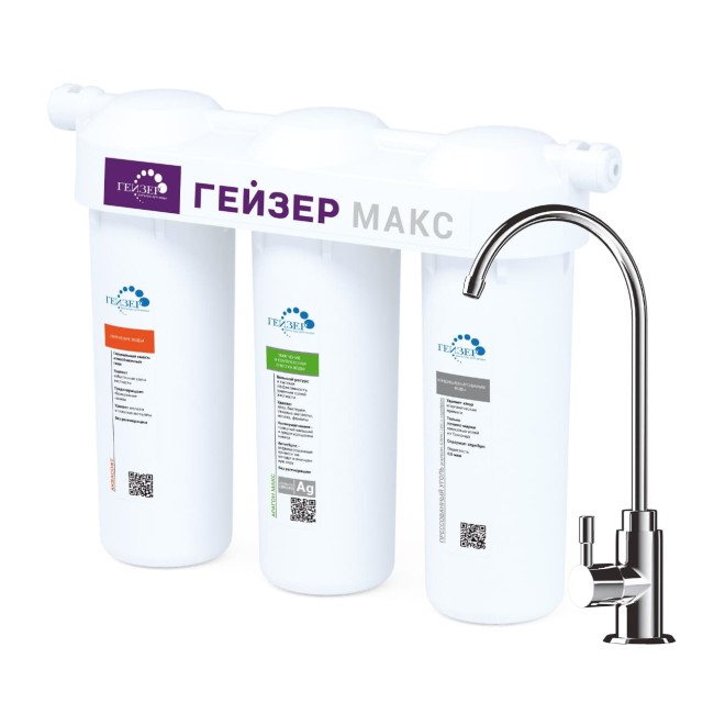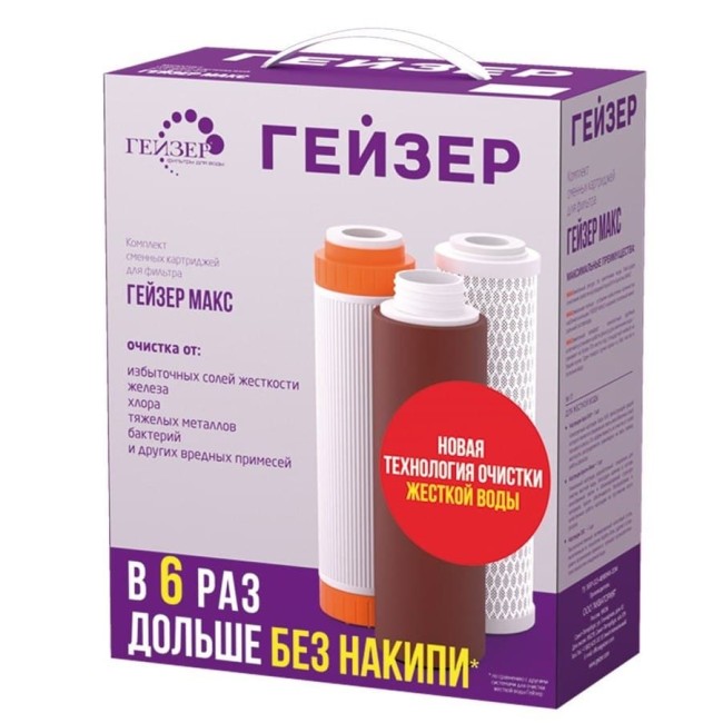 Фильтр Гейзер МАКС для сверхжесткой воды состоит из 3 картриджей: 1. AquaSoft – композитный картридж Aqua Soft фильтрующей средой которого является специальная смесь ионообменных смол питьевого класса. Период работы 12 месяцев без регенерации. 2. Арагон МАКС – уникальный картридж разработанный специально для очистки жесткой воды. Благодаря наличию ионообменной смолы и сбалансированной структуре материала Арагон обеспечивается бесперебойная и качественная работа картриджа на протяжении всего ресурса. 3. CBC-10SL – угольный картридж, карбон-блок удаляет оставшиеся органические примеси, улучшает вкус воды.