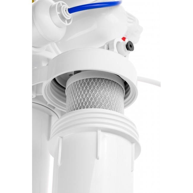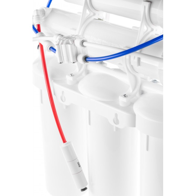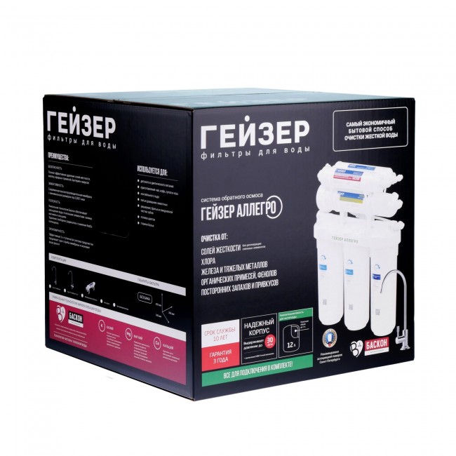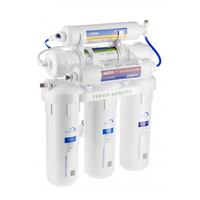 Технология обратного осмоса, использованная в фильтре Гейзер Аллегро М, заключается в фильтровании воды через полупроницаемую мембрану. Размеры пор мембраны настолько малы, что пропускают только молекулы воды. Размер молекул большинства примесей, а также бактерий и вирусов значительно больше молекул воды, поэтому они не проходят через мембрану. Система работает при давлении в подводящей магистрали не менее 3 атм. В комплект входит минерализатор «Вита» для насыщения очищенной воды полезными солями кальция и магния до оптимального уровня жесткости воды — 1–1,5 мг–экв/л. Кран с двумя вентилями обеспечивает подачу воды с минералами (если Вы хотите выпить стакан воды, обогащенной полезными микроэлементами) или без них (для приготовления чая, кофе). Вкус напитков, приготовленных на абсолютно чистой воде гораздо богаче и ароматнее.