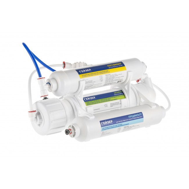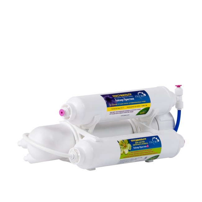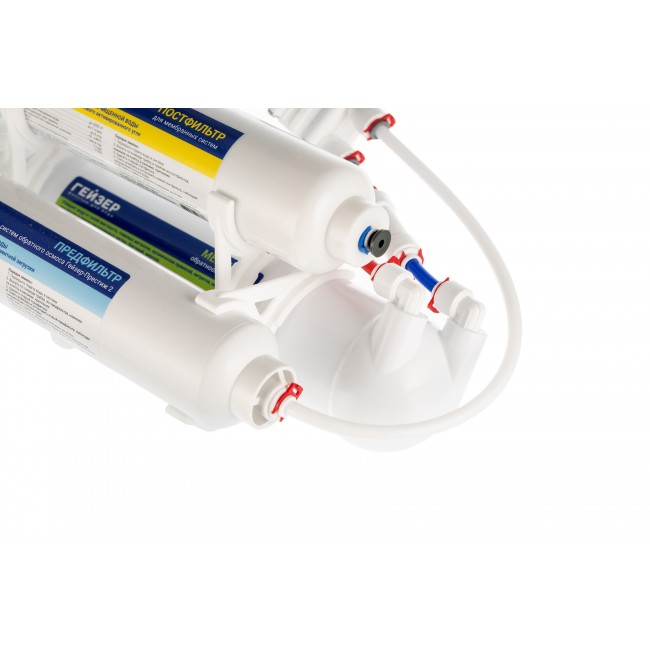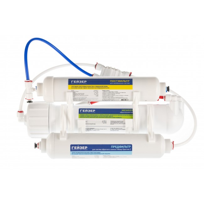 Технология обратного осмоса, использованная в фильтре Гейзер Престиж 2, заключается в фильтровании воды через полупроницаемую мембрану. Размеры пор мембраны настолько малы, что пропускают только молекулы воды. Размер молекул большинства примесей, а также бактерий и вирусов значительно больше молекул воды, поэтому они не проходят через мембрану. Специально разработанный блок предочистки позволяет очищать воду с высоким содержанием солей жесткости и растворенного железа. В фильтре обратного осмоса без накопительного бака применена технология защиты от протечек за счет использования специального крана, который автоматически сбрасывает давление из системы после закрытия, что значительно увеличивает срок службы мембраны и корпуса.