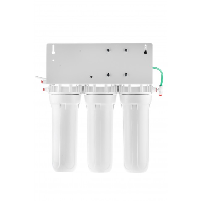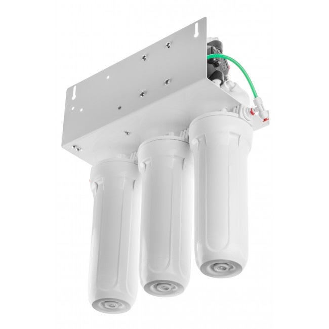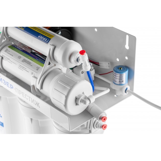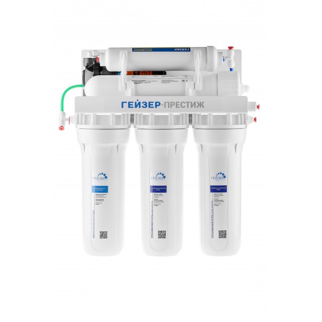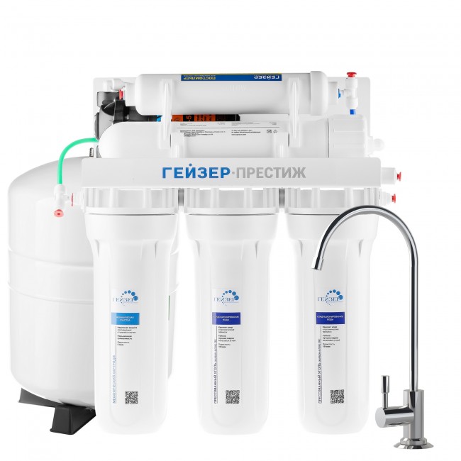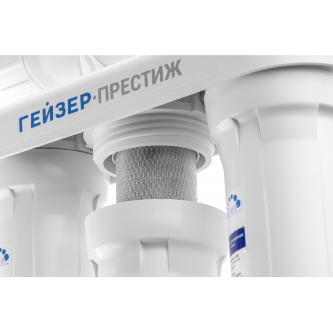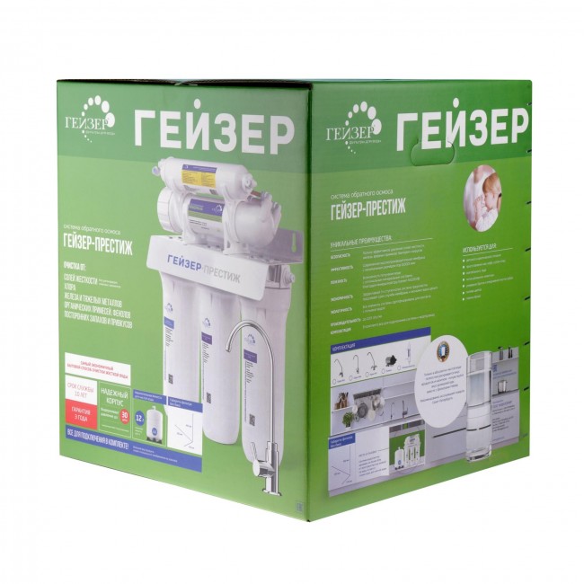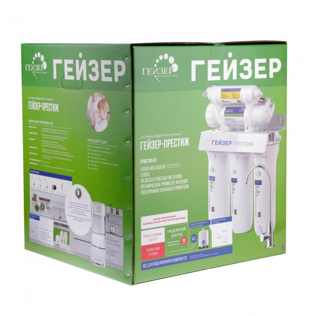 Вода, очищенная фильтром Гейзер Престиж П, близка по своим свойствам к талой воде древних ледников, которая признается наиболее экологически чистой и полезной для человека. Технология обратного осмоса, использованная в фильтре Гейзер Престиж, заключается в фильтровании воды через полупроницаемую мембрану. Размеры пор мембраны настолько малы, что пропускают только молекулы воды. Размер молекул большинства примесей, а также бактерий и вирусов значительно больше молекул воды, поэтому они не проходят через мембрану. Фильтр Гейзер Престиж П работает при давлении в подводящей магистрали не менее 2 атм. Устройство повышения давления, входящее в комплект, повысит уровень давления до 3-6 атм.