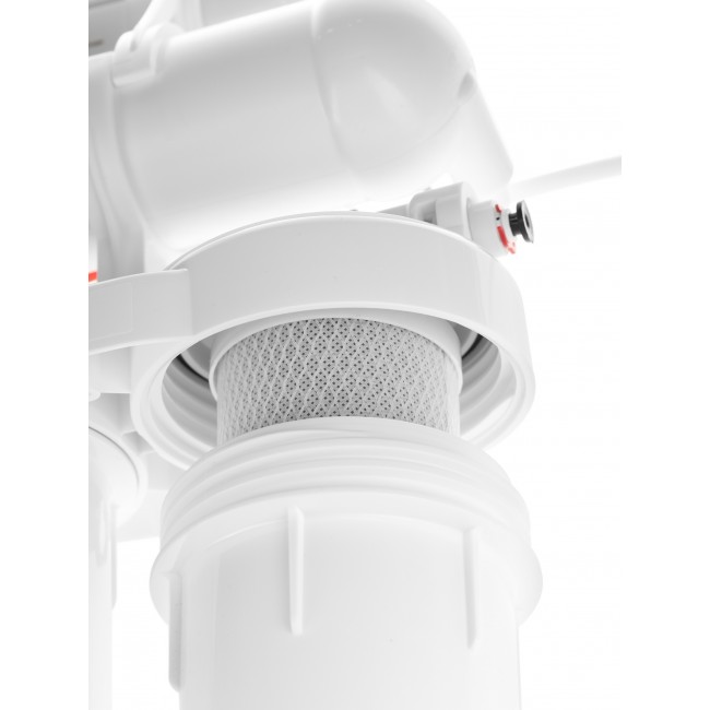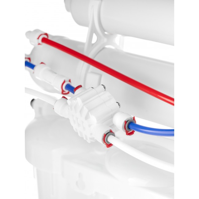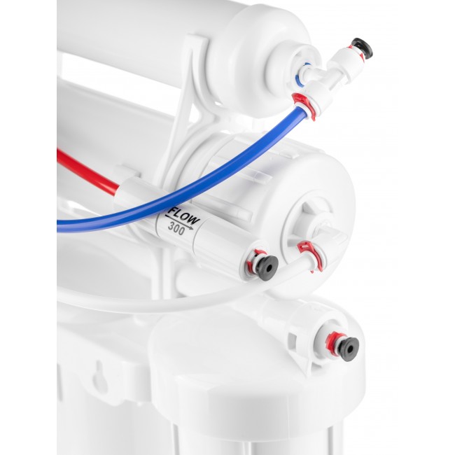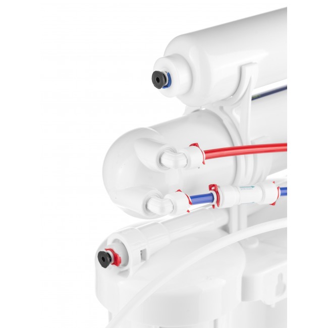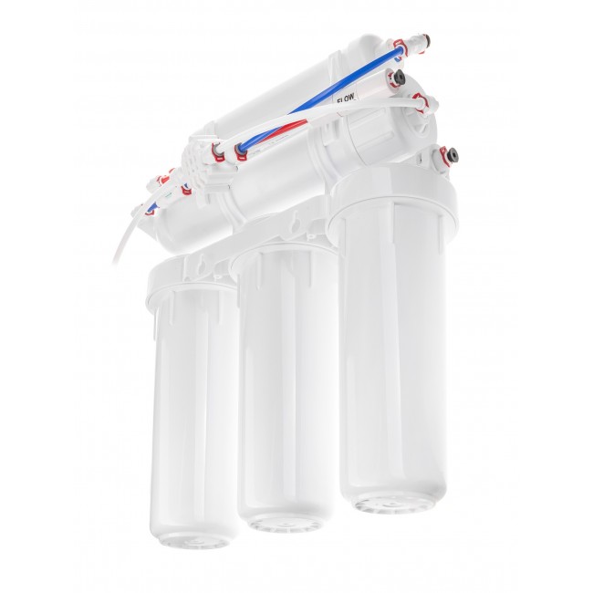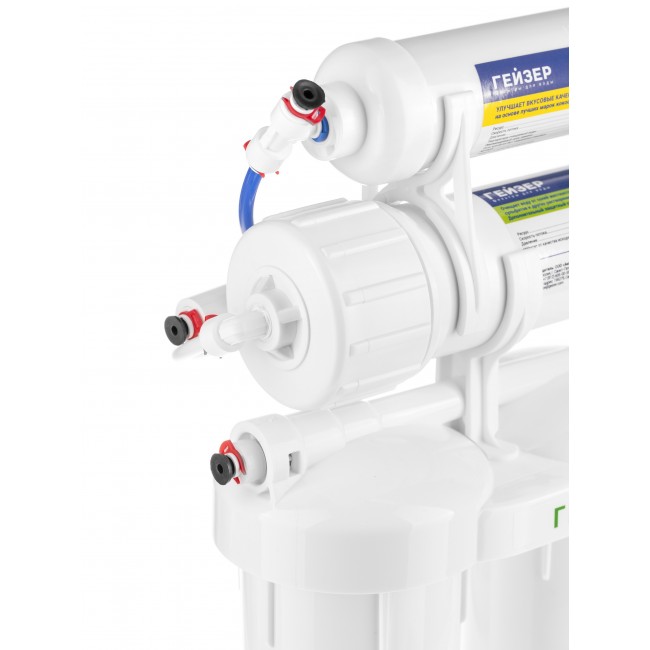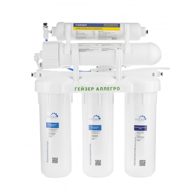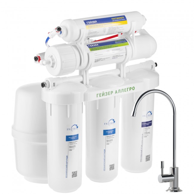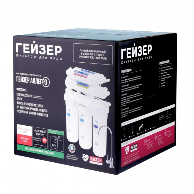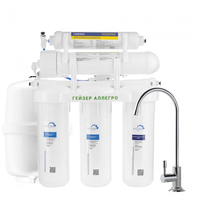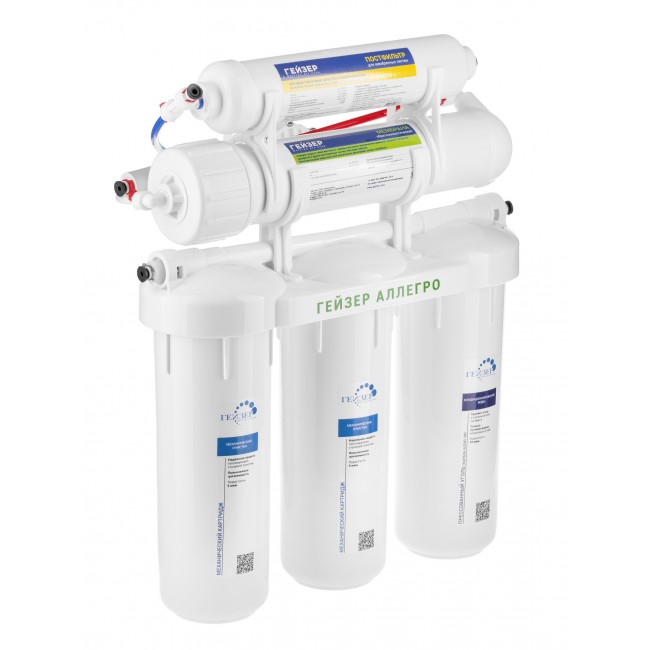 Технология обратного осмоса, использованная в фильтре Гейзер Аллегро, заключается в фильтровании воды через полупроницаемую мембрану. Размеры пор мембраны настолько малы, что пропускают только молекулы воды. Размер молекул большинства примесей, а также бактерий и вирусов значительно больше молекул воды, поэтому они не проходят через мембрану. Система работает при давлении в подводящей магистрали не менее 3 атм.