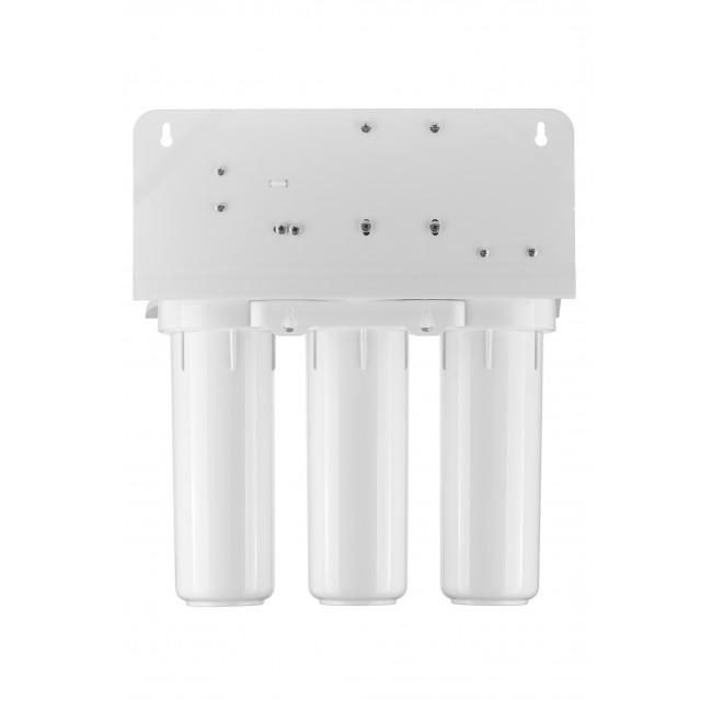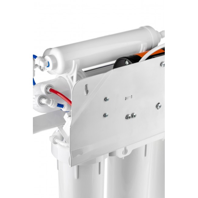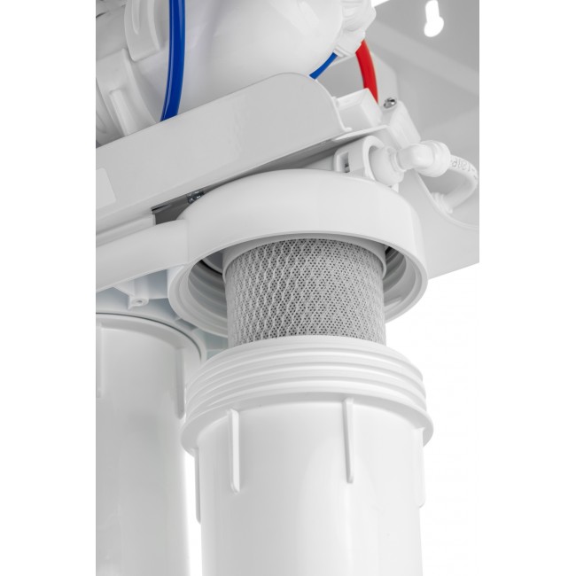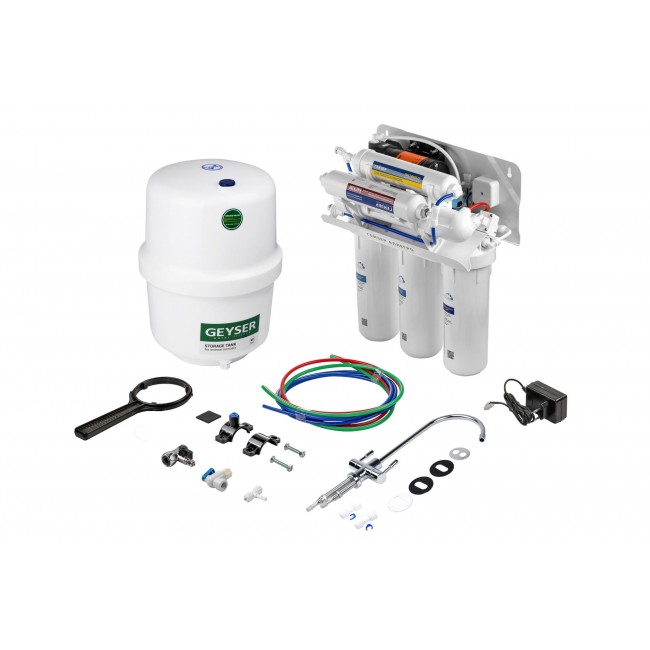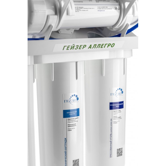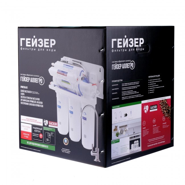 Технология обратного осмоса, использованная в фильтре Гейзер Аллегро ПМ, заключается в фильтровании воды через полупроницаемую мембрану. Размеры пор мембраны настолько малы, что пропускают только молекулы воды. Размер молекул большинства примесей, а также бактерий и вирусов значительно больше молекул воды, поэтому они не проходят через мембрану. Фильтр Гейзер Аллегро ПМ работает при давлении в подводящей магистрали не менее 2 атм. Устройство повышения давления, входящее в комплект, повысит уровень давления до 3-6 атм. В комплект входит минерализатор «Вита» для насыщения очищенной воды полезными солями кальция и магния до оптимального уровня жесткости воды — 1–1,5 мг–экв/л. Кран с двумя вентилями обеспечивает подачу воды с минералами (если Вы хотите выпить стакан воды, обогащенной полезными микроэлементами) или без них (для приготовления чая, кофе). Вкус напитков, приготовленных на абсолютно чистой воде гораздо богаче и ароматнее.
