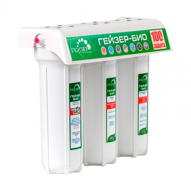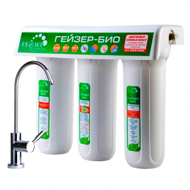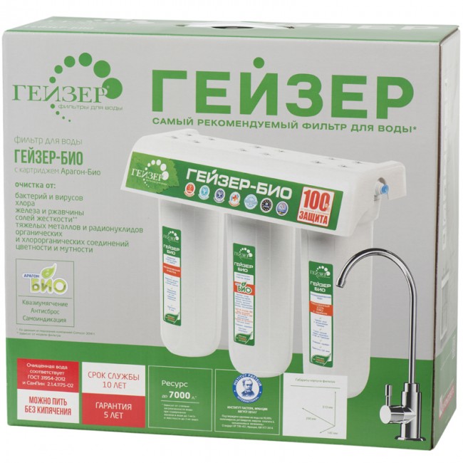 Гейзер 3 Био 331 исп. рекомендуется использовать в районах, где наблюдается повышенное содержание солей жесткости, приводящих к образованию отложений на поверхностях водонагревательных приборов. 1-я ступень – Арагон Ж Био. Удаляет 100% бактерий и вирусов, делая воду полностью безопасной. Снижает содержание солей магния и кальция, уменьшая риск образования накипи. Удаляет хлор, органику, хлорпроизводные, нефтепродукты, пестициды, фенолы, тяжелые металлы, марганец, железо и пр. Обеспечивает эффект квазиумягчения. 2-я ступень – картридж БС - усиливает эффект обработки воды после модуля Арагон Ж Био, дополнительно снижая процент содержания солей жесткости и тяжелых металлов. 3-я ступень – картридж ММВ – высококачественное углеродное волокно, обладающее более развитой площадью поверхности поглощения загрязнений. В состав волокна внедрены ионы активного серебра, обеспечивая дополнительную защиту от болезнетворной фауны.