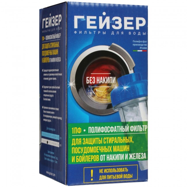 Фильтр Гейзер 1ПФ с полифосфатом используется для защиты нагревательных элементов стиральных, посудомоечных машин и водонагревателей от накипи. Применяется для воды, используемой в технических целях (можно мыть посуду, стирать белье, принимать душ). Фильтр Гейзер 1ПФ обеспечивает бережную стирку (белье становится мягче без применения специальных моющих средств). Фильтр изготовлен из прочного пластика и легко устанавливается на магистраль холодной воды. Прозрачный корпус позволяет контролировать работоспособность системы. При растворении полифосфата более чем на половину необходимо заменить наполнитель.