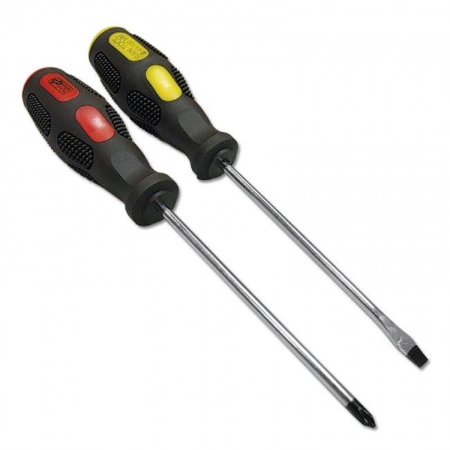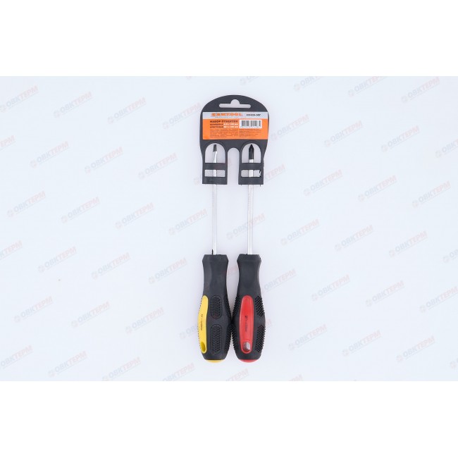 Набор отверток предназначен для проведения слесарных работ в автомобильной промышленности, мебельной индустрии, а также в быту при монтаже оконных, дверных систем и других инженерных конструкций. Эргономичная двухкомпонентная рукоятка обеспечивает удобный захват и эффективное вращение. В набор входят: отвертка шлицевая размером 4,0*100 мм и крестовая №1*100 мм.