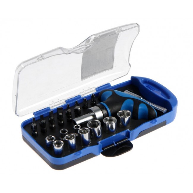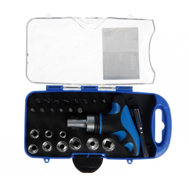 Отвертка с набором бит и торцевых головок предназначены для работы с крепежом. Инструмент изготовлен из хромованадиевой стали. Посадочный размер 1/4". В набор входит 9 шестигранных головок размером: 5, 6, 7, 8, 9, 10, 11, 12, 13 мм; адаптер; удлинитель для бит и биты в количестве 13 штук. Отвертка оснащена прорезиненной рукояткой в форме штопора, что позволяет надежно удерживать инструмент в руке во время работы. Инструменты укомплектованы в прочный пластиковый кейс для удобства хранения и транспортировки.