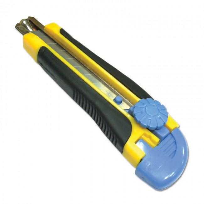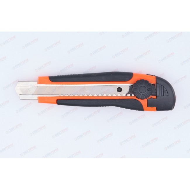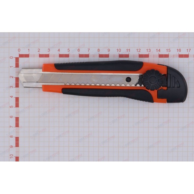 Нож предназначен для разрезания бумаги, картона и прочих материалов с применением небольших усилий, применяется во время ремонтно-отделочных работ. Корпус изготовлен из пластика, усиленного металлической направляющей. Ширина лезвия составляет 18 мм. Обрезиненная рукоятка не выскальзывает во время работы, что обеспечивает комфорт в эксплуатации. Лезвия имеют сегментированную конструкцию: можно легко отколоть затупившийся сегмент. Замена лезвия осуществляется через хвостовую часть ножа.