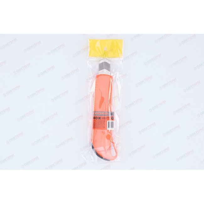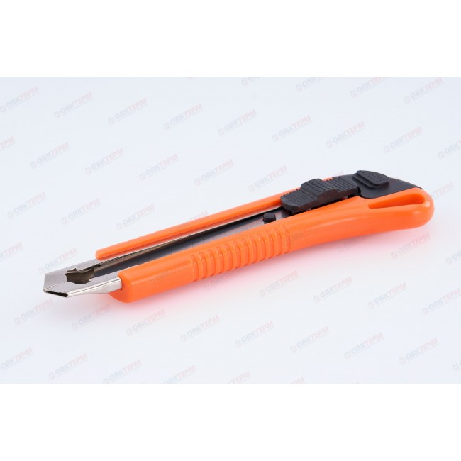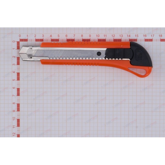 Нож предназначен для разрезания бумаги, картона и прочих материалов с применением небольших усилий, применяется во время ремонтно-отделочных работ. Корпус изготовлен из пластика, усиленного металлической направляющей. Ширина лезвия составляет 18 мм. Лезвия имеют сегментированную конструкцию: можно легко отколоть затупившийся сегмент. Замена лезвия осуществляется через хвостовую часть ножа.