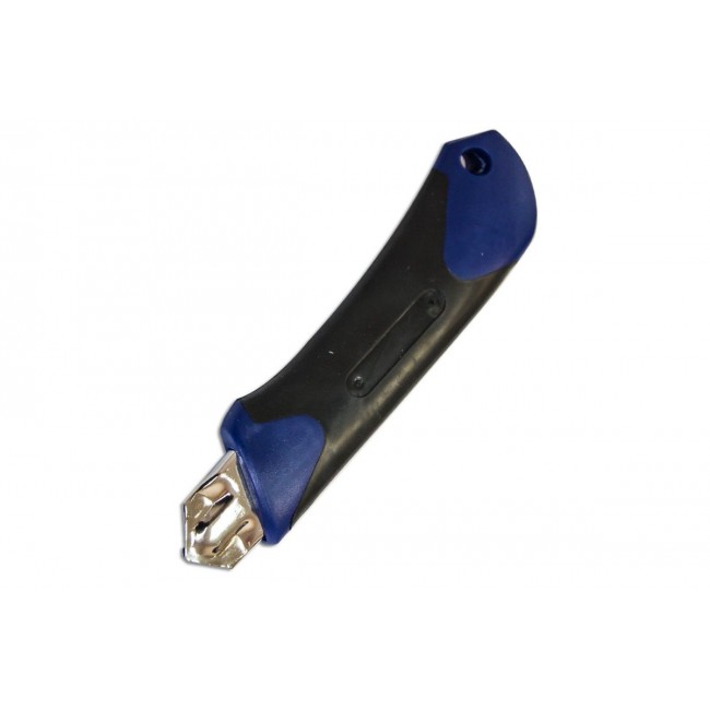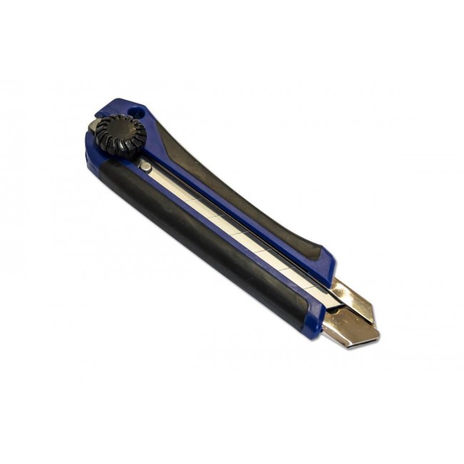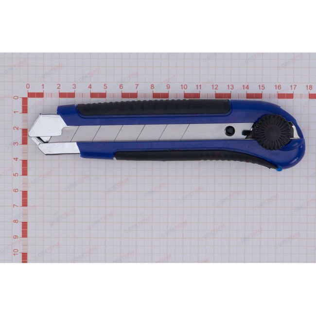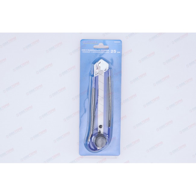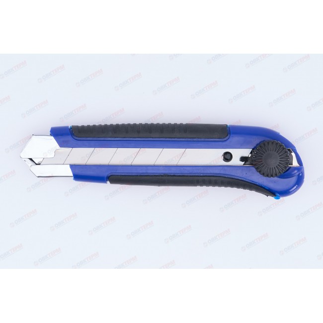 Нож предназначен для разрезания бумаги, картона и прочих материалов с применением небольших усилий, применяется во время ремонтно-отделочных работ. Корпус изготовлен из пластика, усиленного металлической направляющей. Ширина лезвия составляет 25 мм. Обрезиненная рукоятка не выскальзывает во время работы, что обеспечивает комфорт в эксплуатации. Лезвия имеют сегментированную конструкцию: можно легко отколоть затупившийся сегмент. Замена лезвия осуществляется через хвостовую часть ножа.
