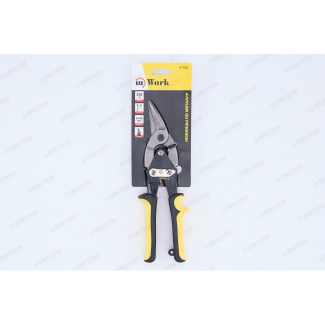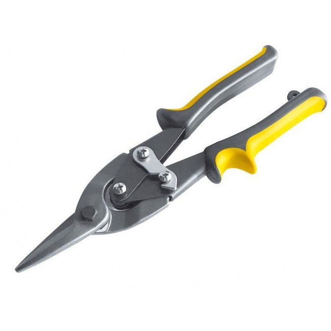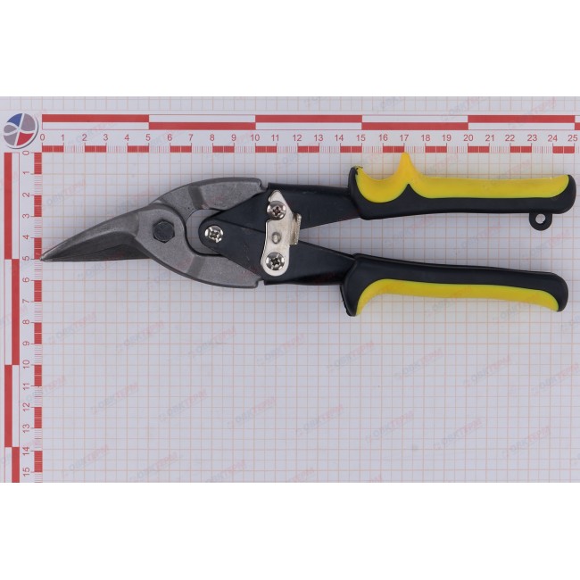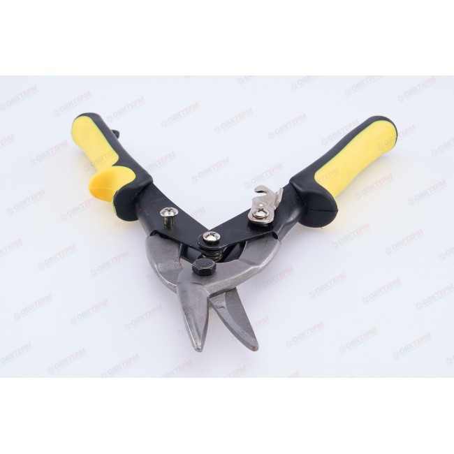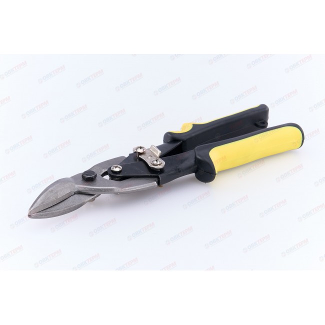 Ножницы по металлу – ручной инструмент для применения в разных сферах при резки тонкого листового металла и других материалов: пластика, резины, линолеума, картона. Режущая способность: листовая сталь до 1 мм, нержавеющая сталь до 0,6 мм. Закалка до твердости 54-58 HRC. Материал: лезвия из высококачественной стали, стальные рукоятки с пластиковыми ручками. На лезвиях имеются зубцы. Тип реза: правый, прямой. Имеется возвратная пружина и крючок. Длина ножниц составляет 250 мм.