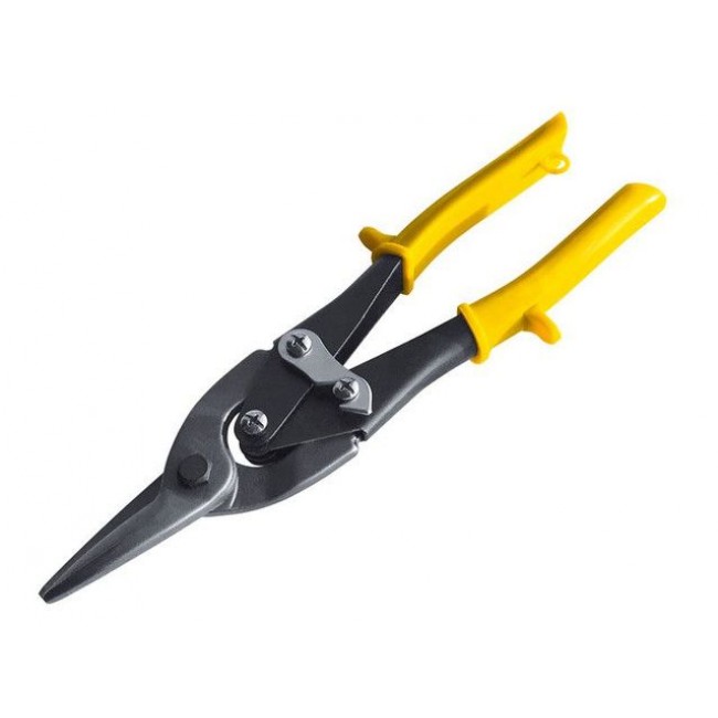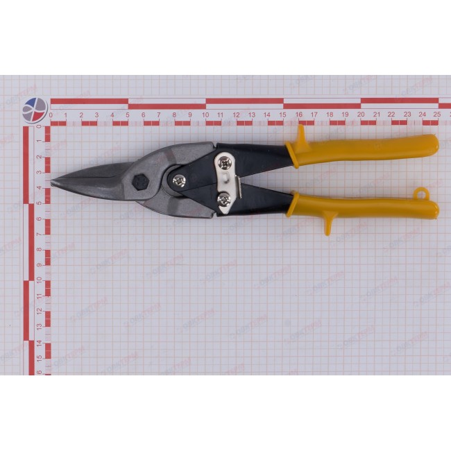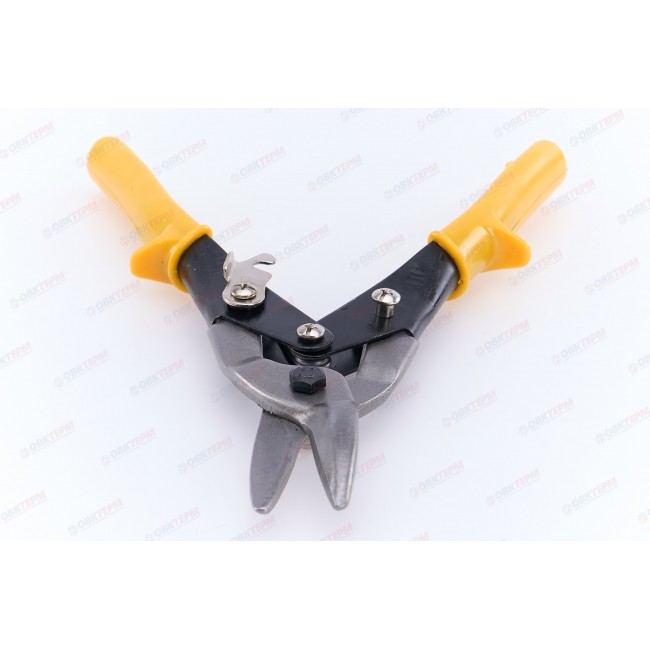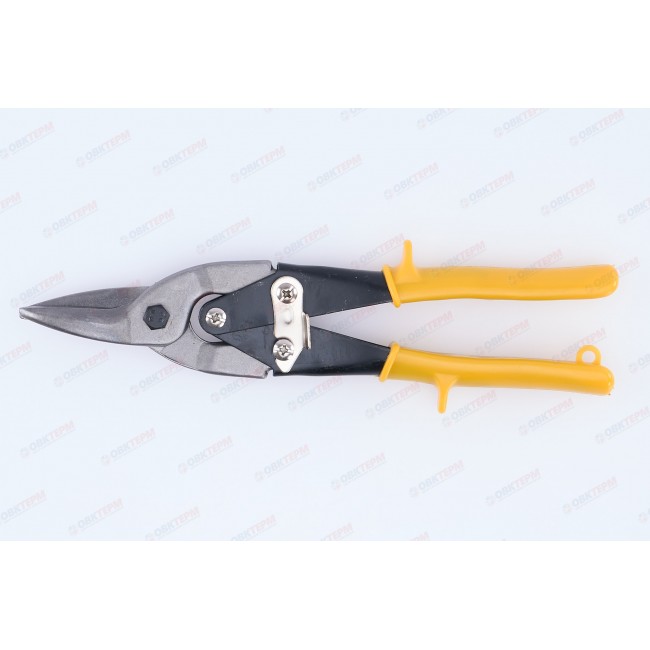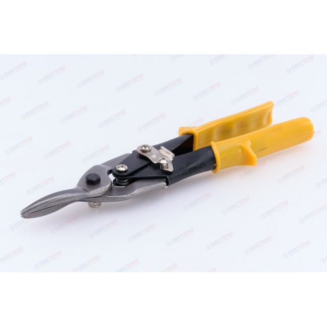 Ножницы по металлу – ручной инструмент для применения в разных сферах при резки тонкого листового металла и других материалов: пластика, резины, линолеума, картона. Режущая способность: листовая сталь до 1 мм, нержавеющая сталь до 0,5 мм. Закалка до твердости 48-50 HRC. Материал: лезвия из высококачественной стали, стальные рукоятки с пластиковыми ручками. На лезвиях имеются зубцы. Тип реза: левый, прямой. Имеется возвратная пружина и крючок. Длина ножниц составляет 250 мм.