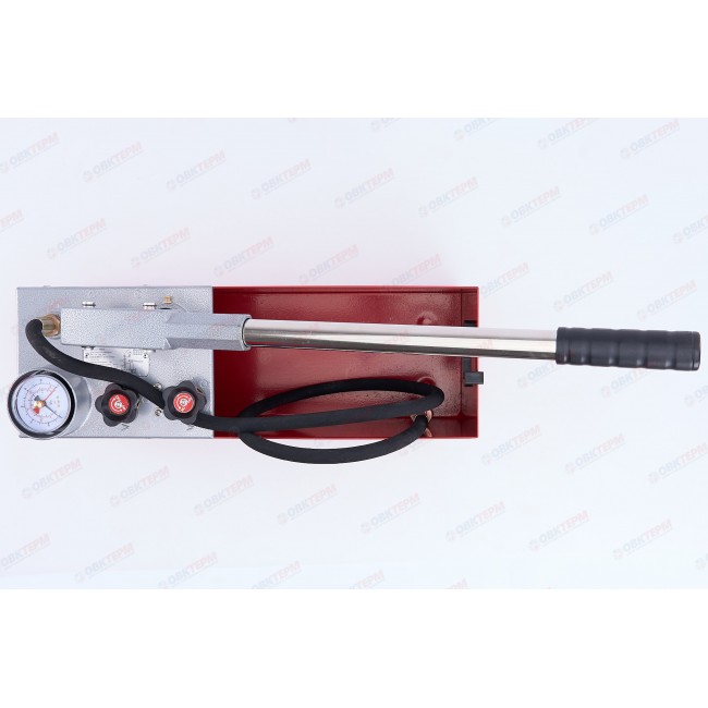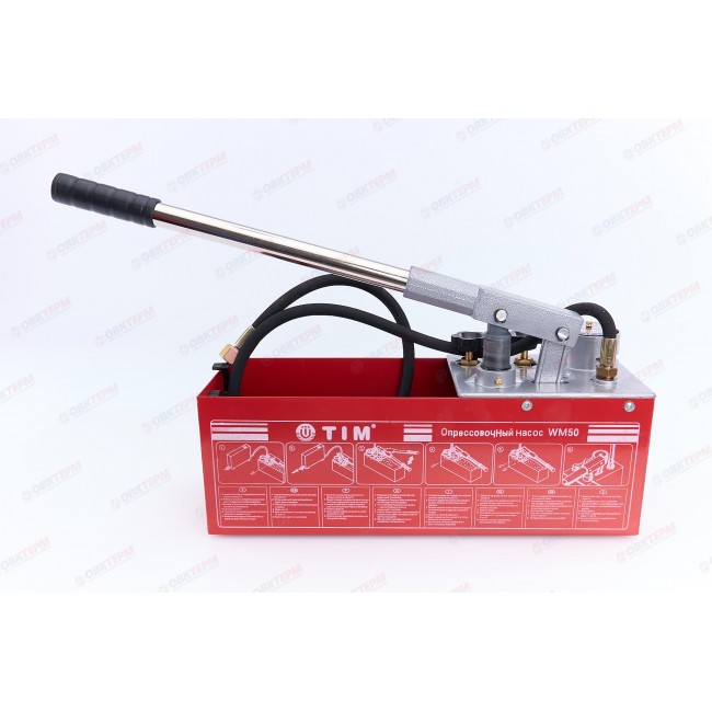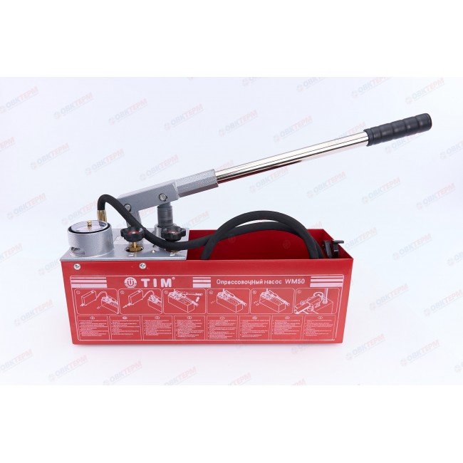 Ручной опрессовщик TiM WM-50 предназначен для точного и быстрого испытания давлением герметичности трубопроводов, резервуаров, водопроводных, отопительных и канализационных системах. В котлостроении и при производстве напорных резервуаров Технические характеристики: Давление: 60 бар; Объём резервуара: 12 л; Рабочая среда: Вода; Расход: 450 мл/такт; Соединение: R 1/2"; Вес 8,2 кг .