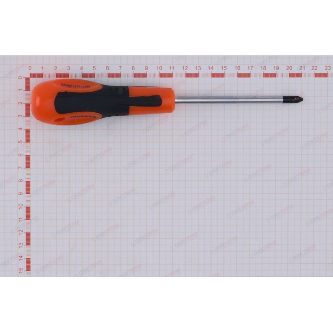 Отвертка крестовая предназначена для проведения слесарных работ в автомобильной промышленности, машиностроении, мебельной индустрии, а также в быту при монтаже оконных, дверных систем и других инженерных конструкций. Изготовлена из хромованадиевой стали, устойчивой к коррозии. Эргономичная двухкомпонентная рукоятка обеспечивает удобный захват и эффективное вращение. Длина стержня составляет 100 мм. Размер шлица PH2.