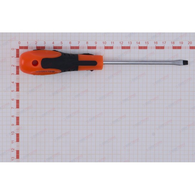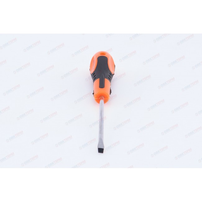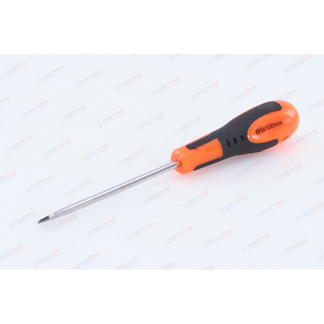 Отвертка шлицевая предназначена для проведения слесарных работ в автомобильной промышленности, машиностроении, мебельной индустрии, а также в быту при монтаже оконных, дверных систем и других инженерных конструкций. Изготовлена из хромованадиевой стали, устойчивой к коррозии. Эргономичная двухкомпонентная рукоятка обеспечивает удобный захват и эффективное вращение. Длина стержня составляет 100 мм. Размер шлица SL5.