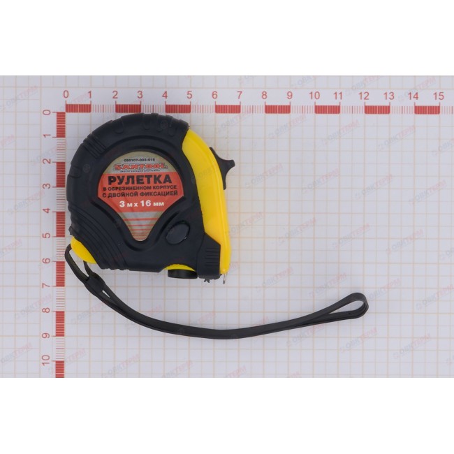 Рулетка предназначена для измерения размеров и расстояний. Изготовлена из высококачественной инструментальной стали. Ударопрочный обрезиненный корпус предотвращает выскальзывание. Имеется двойной фиксатор для удержания ленты на необходимой длине. Размер измерительной ленты 3 м х 16 мм. Цена деления – 1 мм.