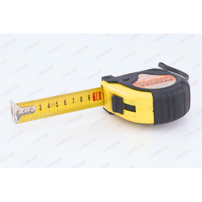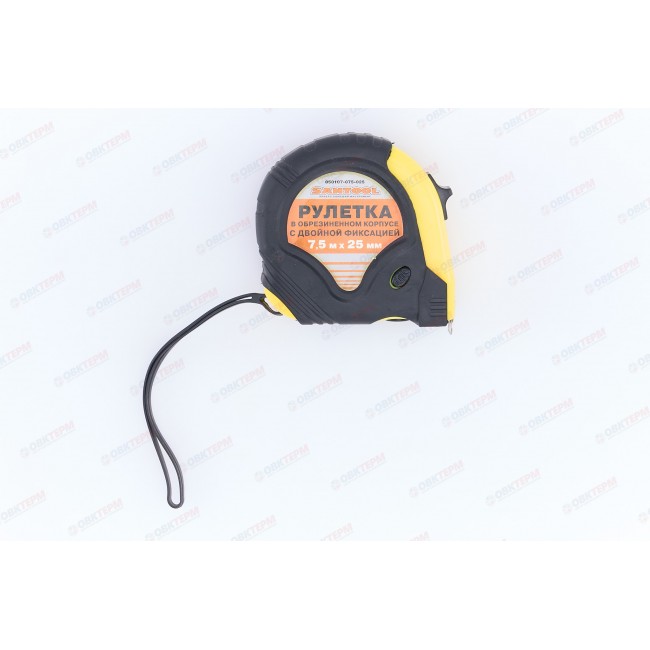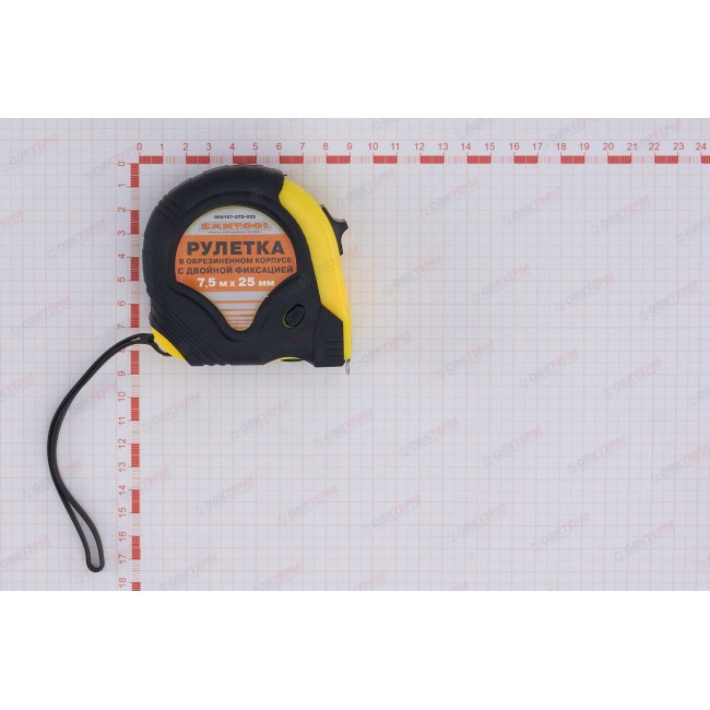 Рулетка предназначена для измерения размеров и расстояний. Лента имеет двухстороннюю метрическую шкалу, а так же фиксатор для удержания ленты на необходимой длине. Корпус изготовлен из ударопрочного пластмасса. Размер измерительной ленты 7,5 м х 25 мм. Цена деления – 1 мм.