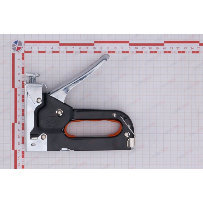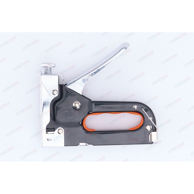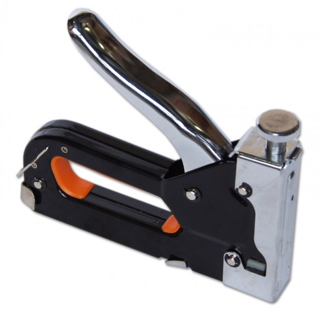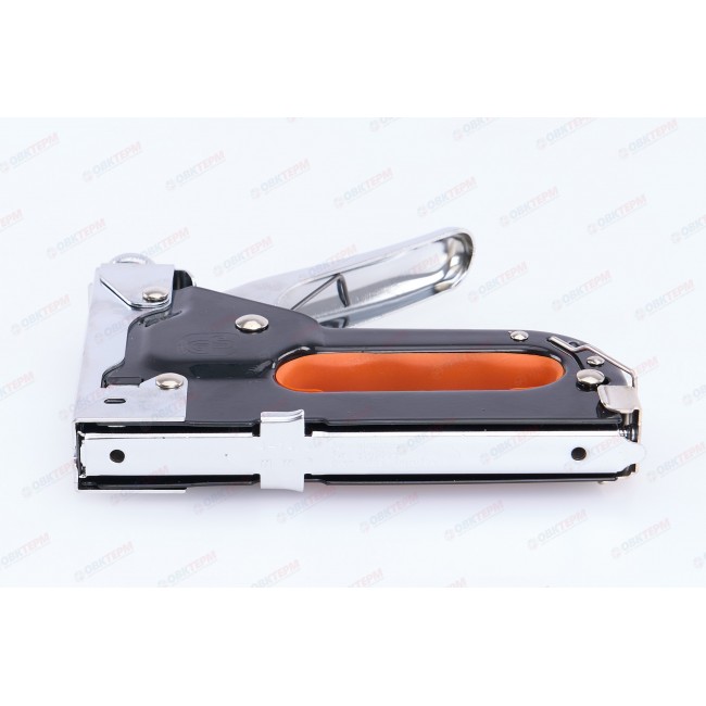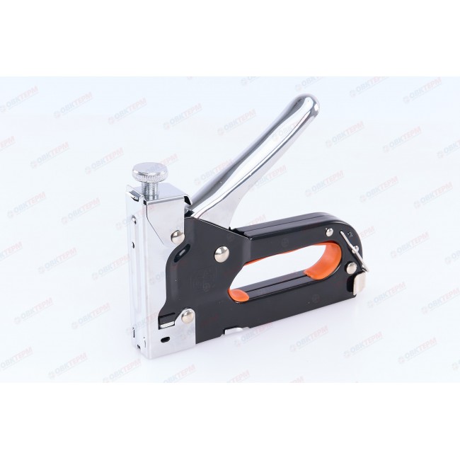 Применяется для крепления материалов к поверхностям из дерева, ДСП, гипсокартона и т.п. Степлер изготовлен из хромованадиевой стали, окрашен. На внутренней стороне рукоятки специальная прокладка для удобства. Оснащен фиксатором и регулируемым механизмом для контроля силы удара. Для скоб 4-14 мм, тип скобы №53.
