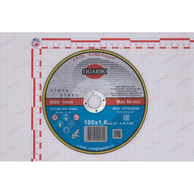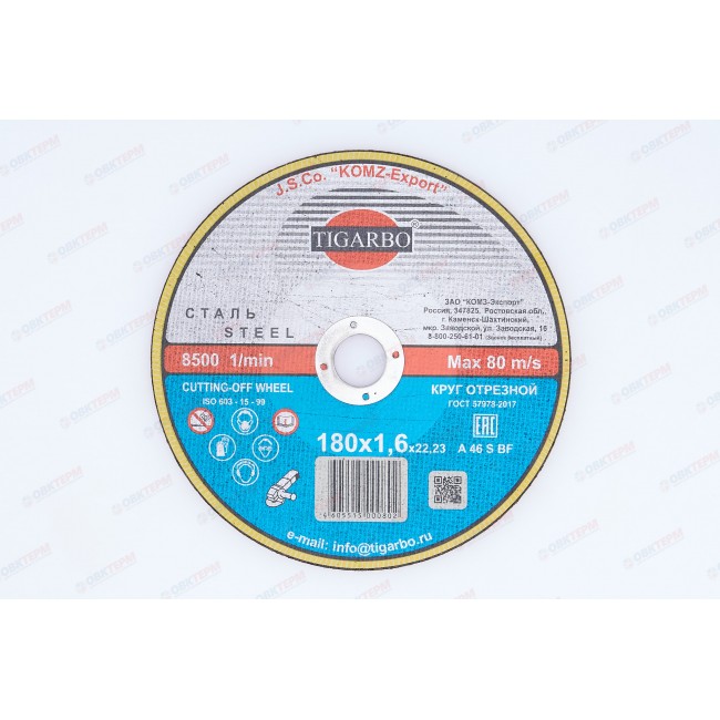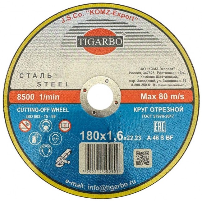 Диск отрезной Tigarbo предназначается для качественной и точной резки изделий, изготовленных из стали. Выполнен из высококачественного материала, состоит из частиц оксида алюминия, армирован специальной сеткой, которая обеспечивает диску дополнительную прочность. Абразивный отрезной круг устанавливается непосредственно на ось угловой шлифовальной машины, двигатель которой сообщает ему вращательное движение. Диаметр диска составляет 180 мм, толщина 1,6 мм, диаметр посадочного отверстия 22,2 мм. Максимально число оборотов в минуту – 8500, Максимальная скорость вращения – 80 м/с.