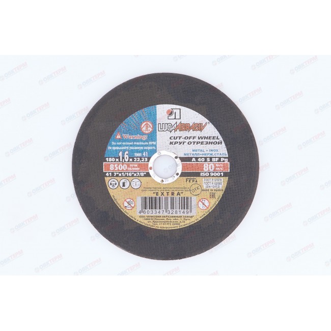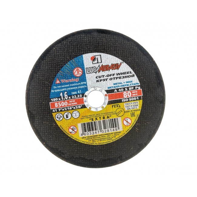 Круг отрезной LUGA предназначается для качественной и точной резки изделий, изготовленных из различных марок стали, нержавеющей стали и быстрорежущей стали. Круг особенно эффективен при резке тонкостенного профиля и листового металла. Выполнен из высококачественного материала, электрокорунда нормального на основе армированной бакелитовой связки, придающей прочность конструкции. Абразивный отрезной круг устанавливается непосредственно на ось угловой шлифовальной машины, двигатель которой сообщает ему вращательное движение. Диаметр диска составляет 180 мм, толщина 1,6 мм, диаметр посадочного отверстия 22,2 мм. Максимально число оборотов в минуту – 8 500. Максимальная скорость вращения – 80 м/с.