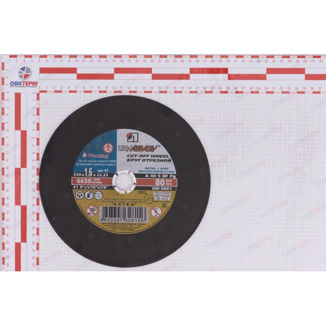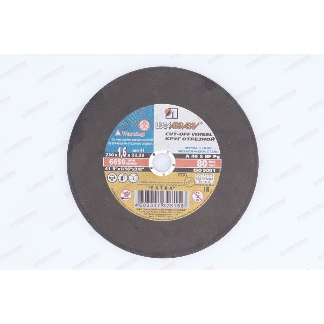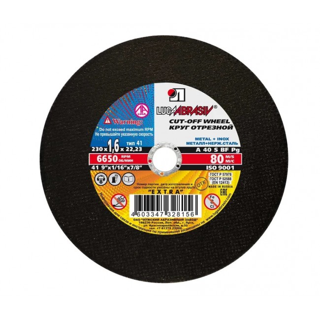 Круг отрезной LUGA предназначается для качественной и точной резки изделий, изготовленных из различных марок стали, нержавеющей стали и быстрорежущей стали. Круг особенно эффективен при резке тонкостенного профиля и листового металла. Выполнен из высококачественного материала, электрокорунда нормального на основе армированной бакелитовой связки, придающей прочность конструкции. Абразивный отрезной круг устанавливается непосредственно на ось угловой шлифовальной машины, двигатель которой сообщает ему вращательное движение. Диаметр диска составляет 230 мм, толщина 1,6 мм, диаметр посадочного отверстия 22,2 мм. Максимально число оборотов в минуту – 6650. Максимальная скорость вращения – 80 м/с.