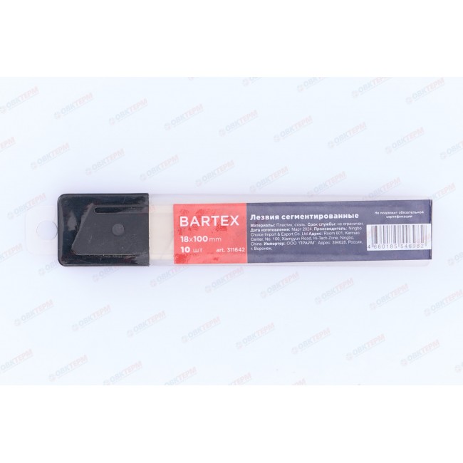 Лезвия Bartex являются запасными элементами для технического ножа. Изготовлены из инструментальной стали. Применяются для реза тонких, неплотных материалов: линолеума, картона, бумаги, пластика, кожи, резины и т.д. Сегментированные трапециевидные лезвия имеют насечки, чтобы отломить затупившийся сегмент и продолжить работу новой режущей кромкой. Это помогает сэкономить время, не отвлекаясь на заточку ножа. Ширина лезвия составляет 18 мм, длина 100 мм. В наборе 10 полотен.