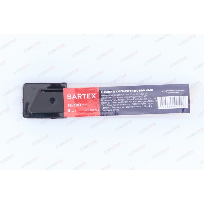 Лезвия Bartex являются запасными элементами для технического ножа. Изготовлены из инструментальной стали. Применяются для реза тонких, неплотных материалов: линолеума, картона, бумаги, пластика, кожи, резины и т.д. Сегментированные трапециевидные лезвия имеют насечки, чтобы отломить затупившийся сегмент и продолжить работу новой режущей кромкой. Это помогает сэкономить время, не отвлекаясь на заточку ножа. Ширина лезвия составляет 18 мм, длина 100 мм. В наборе 5 полотен.